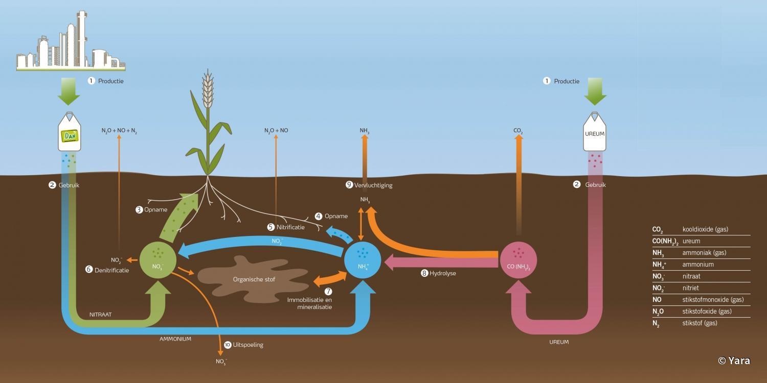 Il faut une quantité suffisante d’azote pour que les plantes puissent pousser correctement et offrir un bon rendement. En revanche, une quantité trop importante par rapport aux besoins à court terme peut provoquer une libération d’azote dans l’atmosphère ou donner lieu à une consommation inutile. Pour maximiser les rendements et réduire le plus possible l’impact sur l’environnement, il convient donc d’apporter une quantité d’azote qui soit en phase avec les besoins de la plante tout en tenant compte des nutriments disponibles dans le sol. Pour un dosage précis, les engrais dotés d’un profil de libération d’azote prévisible, permettant donc de limiter les pertes, sont les plus adaptés. Cela vaut notamment pour les engrais DAN, mais généralement pas pour les engrais tels que l’urée. La libération de nitrate à partir d’urée et les pertes par volatilisation dépendent fortement des conditions météorologiques. Il s’avère donc très difficile de réaliser des prévisions fiables, ce qui peut rapidement entraîner un manque ou un excédent d’engrais. L'application d'engrais spécifiques à base d’inhibiteur d'uréase ou de nitrification, d'engrais à libération lente (slow release) et d'engrais à libération par enrobage (coated release), sur un endroit spécifique, peut assurer une absorption encore plus efficace des nutriments des plantes.